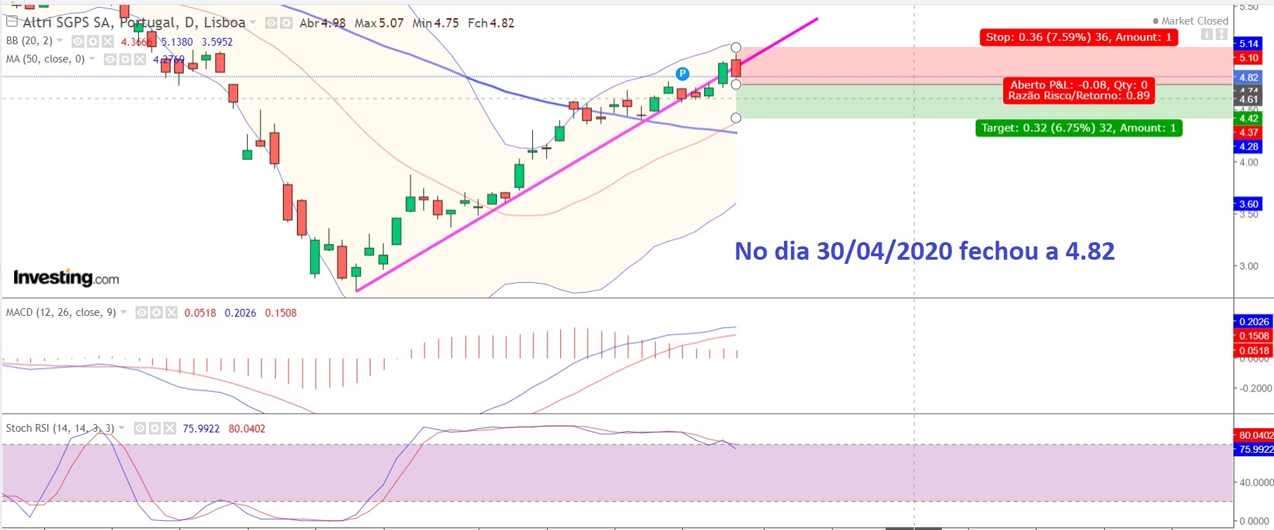 Fechei a posição hoje, dia 13/05/2020, no fecho da sessão a 4.268 €. Na realidade como estava curto, tenho que adicionar o dividendo de 0,30€ que será pago aos detentores das ações. Ou seja, fecho a posição a 4.568 € correspondendo a uma rentabilidade de 3.63%. Mesmo sem este efeito do dividendo, a ação ao quebrar a LTA (Linha de Tendência Ascendente) deu um resultado interessante numa semana e meia.