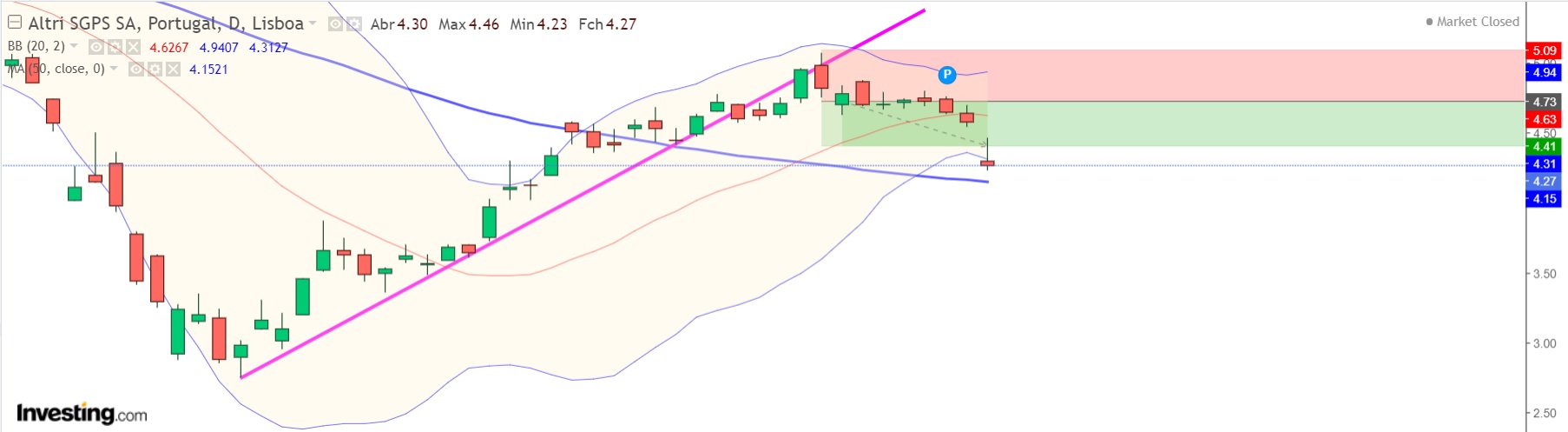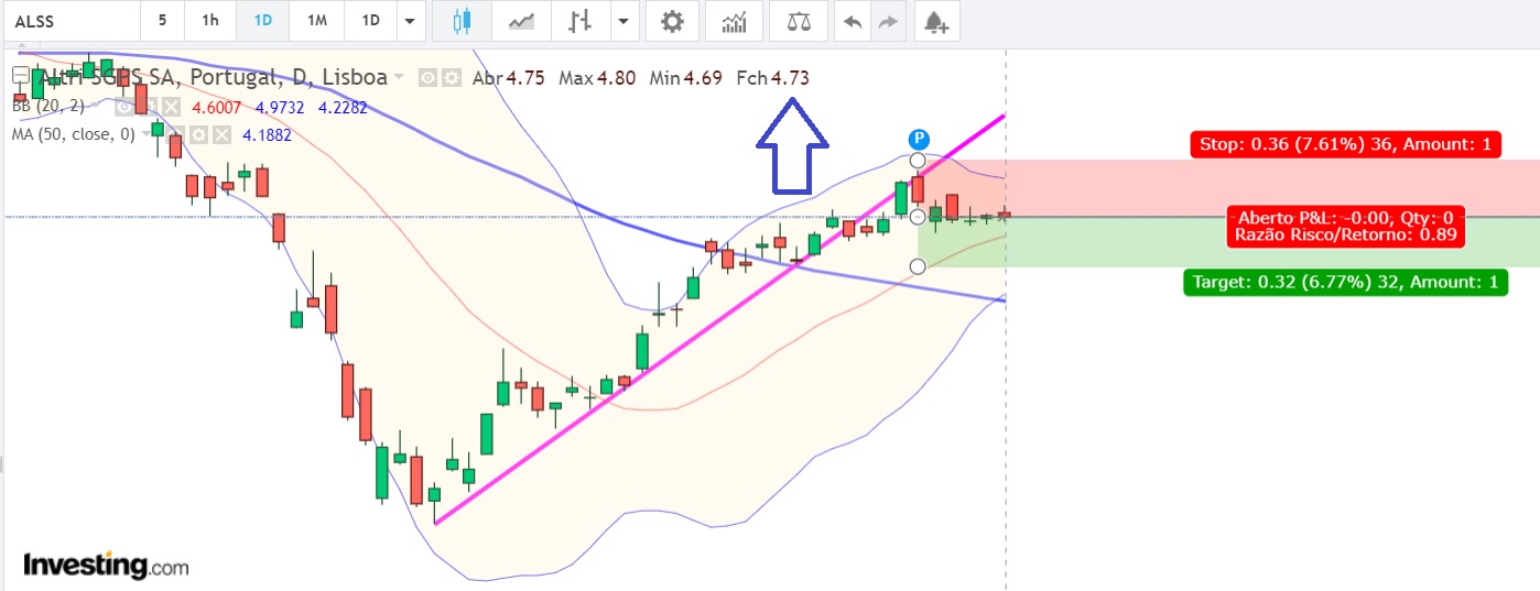 Uma semana muito calma na Altri. Logo na 2ª feira foi acionada a entrada nos 4.74 mas a cotação teve muito pouca volatilidade durante a semana e fechou na 6ª feira nos 4.73. Neste momento apenas existe uma certeza ... a linha de tendência ascendente foi rompida! É também possível de observar um estreitamento das Banda de Bollinger e a cotação a aproximar-se da média móvel de 20 períodos. Vou esperar pelo início da semana porque deve trazer novidades ... boas ou más!