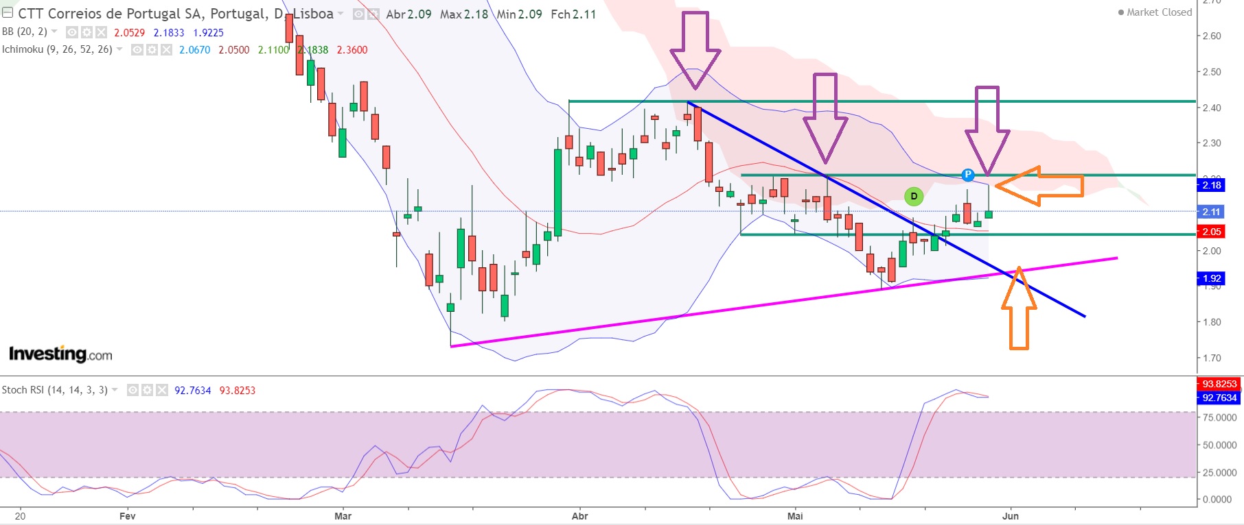 Nas últimas 4 sesões, por 3 vezes fez o mínimo em 2.18! Na 6ª feira, fechou abaixo da média da Banda de Bollinger! Se amanhã, dia 22/06/2020, romper os 2.18, entro curto a 2.17. Se no início da sessão o valor abrir mais abaixo, por exemplo 2.15, entre curto até esse valor. A saída está programada para os 2.05. O stop loss fica nos 2.30, dois cêntimos acima do valor máximo das últimas 4 sessões! Este é um exercício de swing trading!