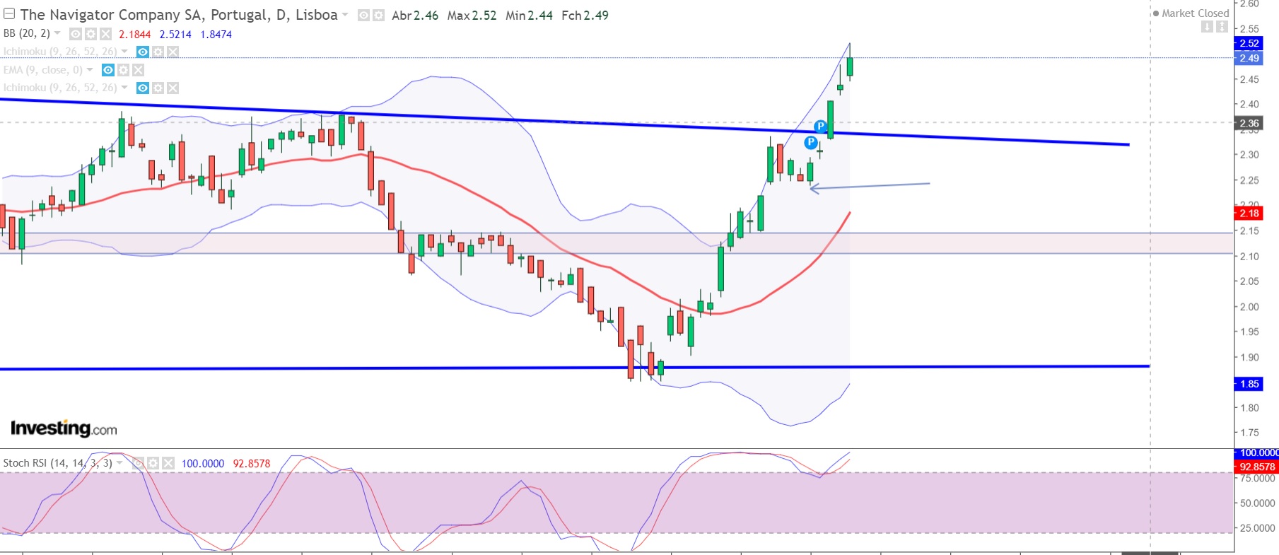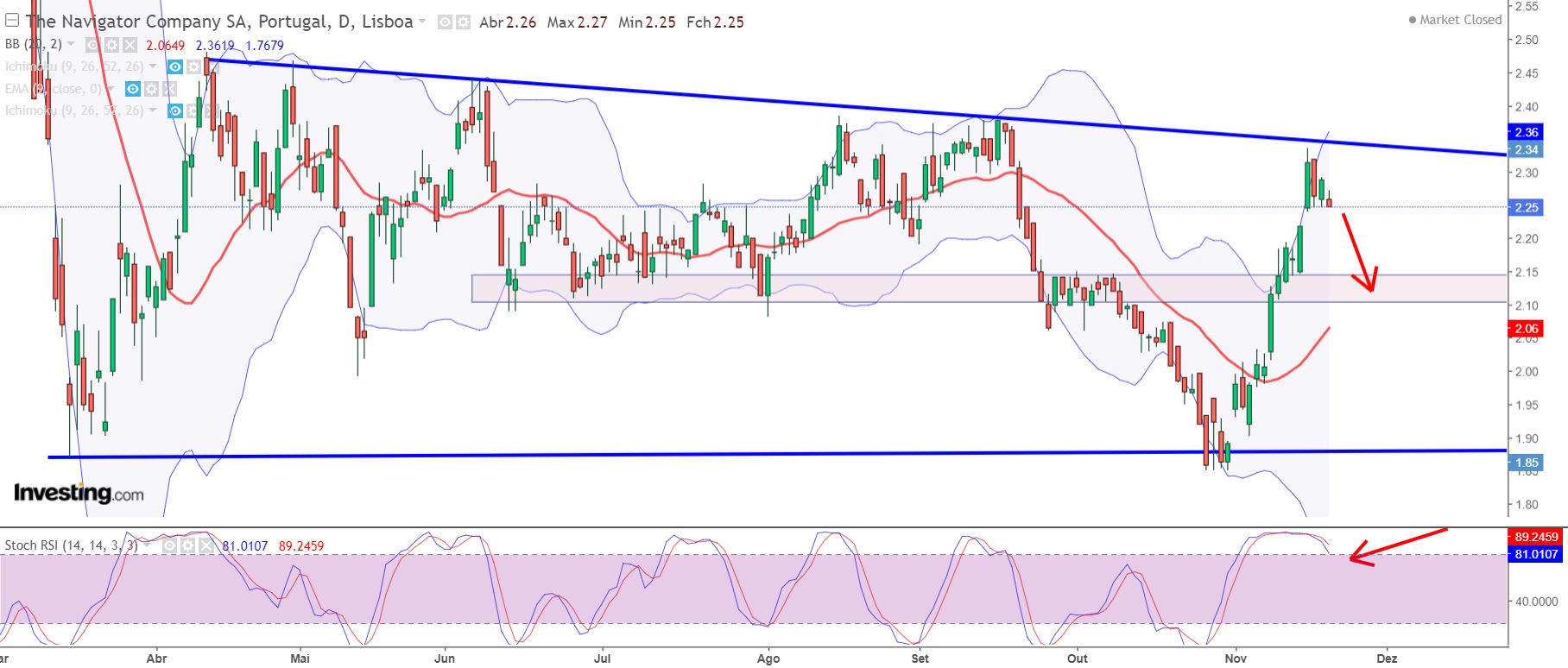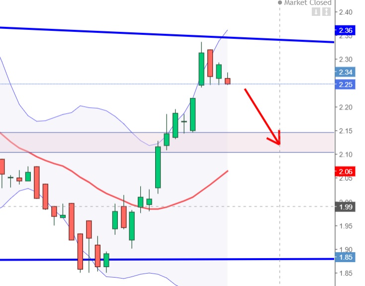 Momento interessante no curto prazo! Nas Bandas de Bollinger será que vai ativar o setup do "fecha fora fecha dentro"? Se fizer 2.24 entro curto nesse patamar com o objetivo dos 2.10, que são 50% da retração da última subida! Coloco o stop nos 2.36, um pouco acima da LTB que está a funcionar como resistência.